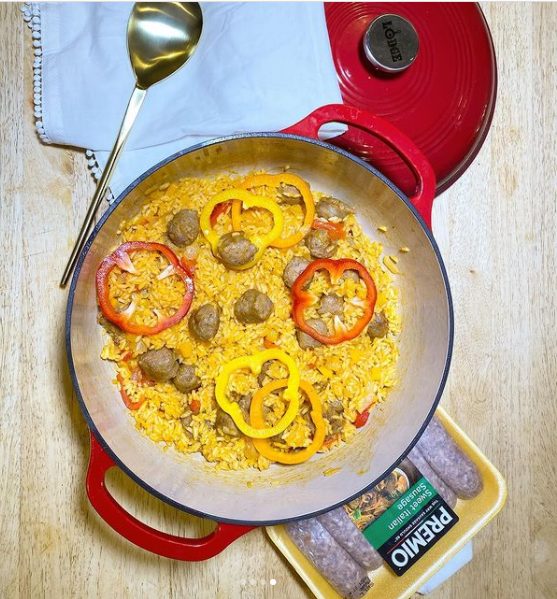 - When the sausages are done, mix them into the rice. Serve immediately. Enjoy!