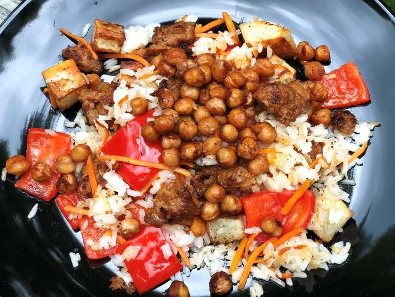 7. Divide up the rice mixture among bowls. Top with the chickpeas and serve.