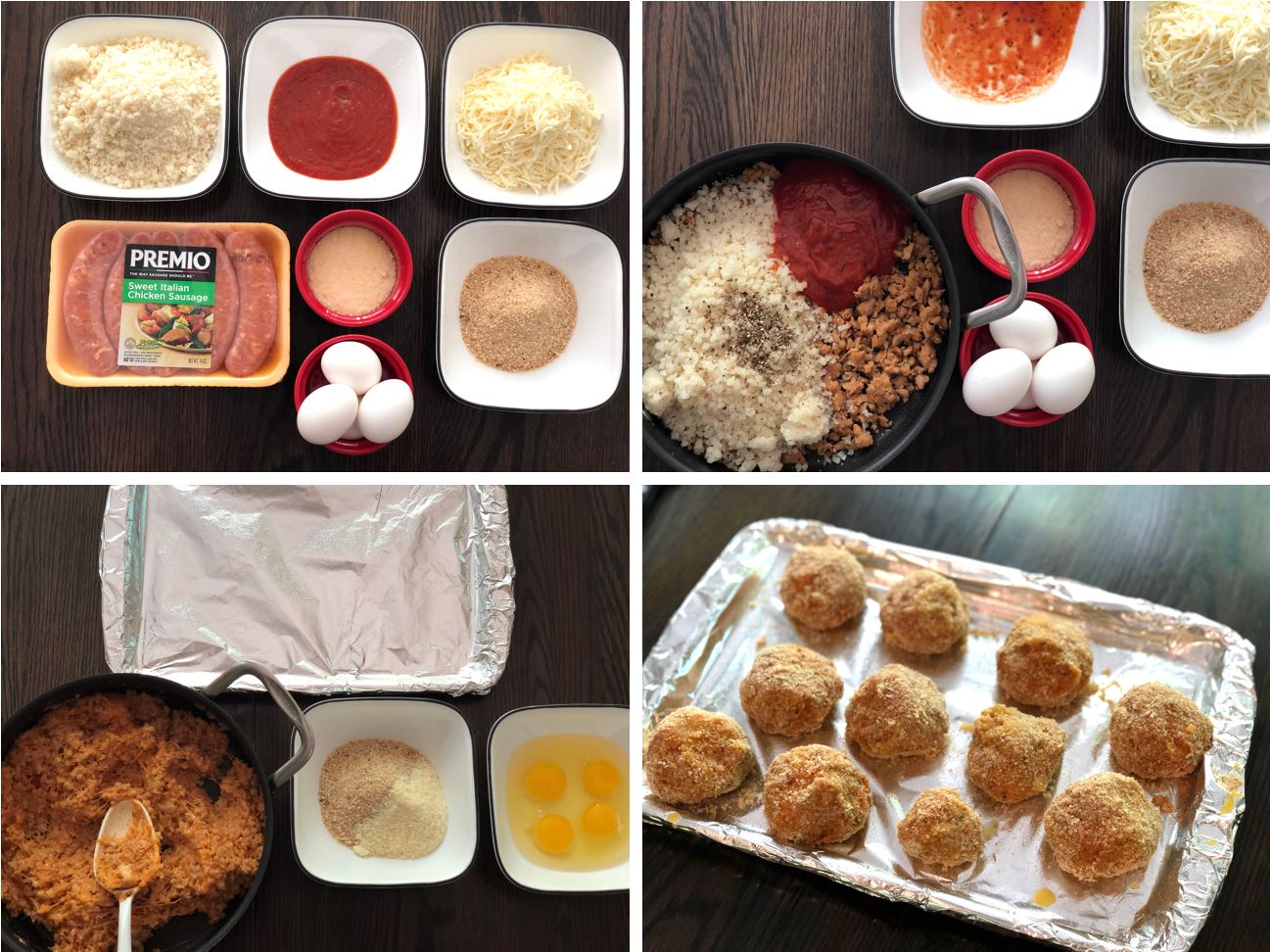 9. Carefully dip each cauliflower-sausage ball into the beaten egg to cover. Then move the egg-coated ball into the breadcrumb mixture. Coat it completely and place it on your baking sheet. Continue until all cauliflower-rice balls are coated.
