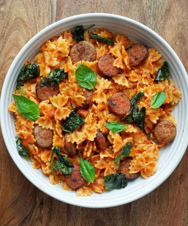 Farfalle with Vodka Sauce, Premio Sausage, Spinach and Basil