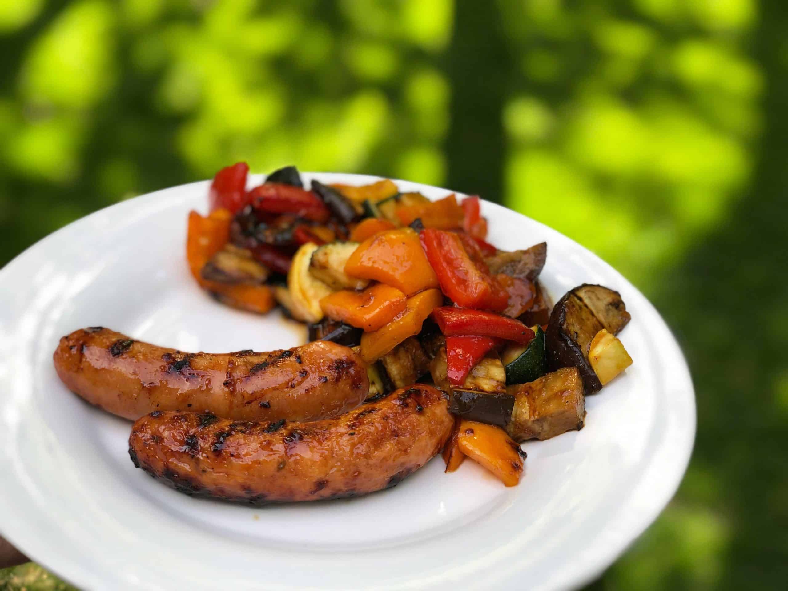 7. Cut the grilled vegetables into smaller chunks and pieces. Place cut-up grilled vegetables into a large mixing bowl and toss with the remaining sauce. Prepare each plate with a whole or half sausage link and vegetables. Serve the grilled sausage recipe with veggies warm with fresh rolls and creamery butter.