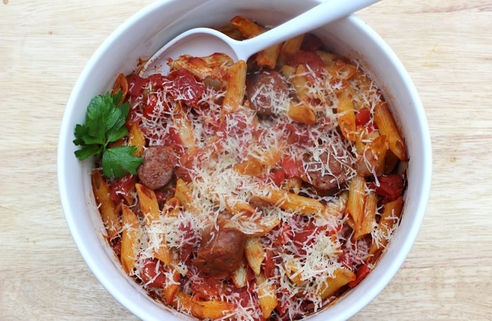 4. To serve: transfer the mixture to a casserole and bake in oven until piping hot and the sausage is cooked through about 45 minutes. Remove from the oven and sprinkle with cheese. Serve!