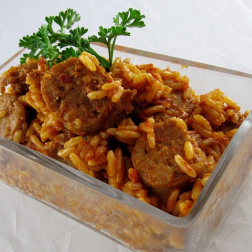 4. Place one cup of the rice on the bottom of casserole. Pour sausage and all but 1/2 cup of sauce. Place the remaining rice on top. Pour the last 1/2 cup on top of top layer of rice.