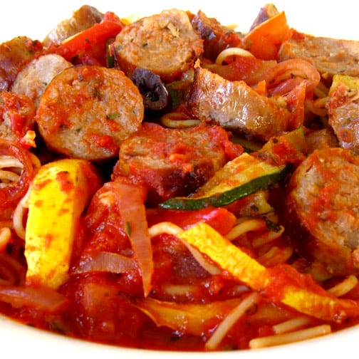 1. In a large sauce pan over medium high heat, cut Premio Sausage into bite-sized pieces; add to sauce pan and brown. Once sausage starts to brown, add vegetables.