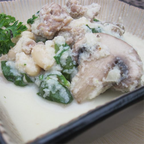 3. Bring to a boil and add spinach, cream, fennel seed, salt, pepper, white beans, green broad beans and mushrooms. Bring to a simmer and cook, covered, for 15 minutes.