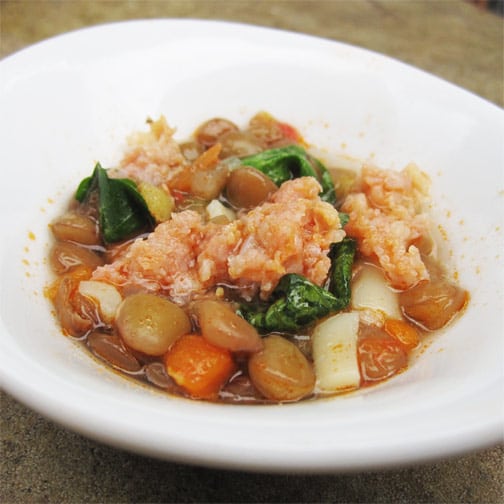 5. Remove large stems from spinach and cut into bite sized pieces. Add to stock pot and continue to cook for another 2 minutes, until finished.