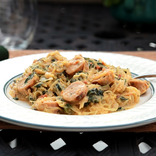 4. Once the squash is cool enough to handle, use a fork to scrape out the inside of the squash (into a large pot) away from its skin. Slice the sausage into bite-size pieces and place into the pot. Also place the onion, garlic and spinach into the same pot.