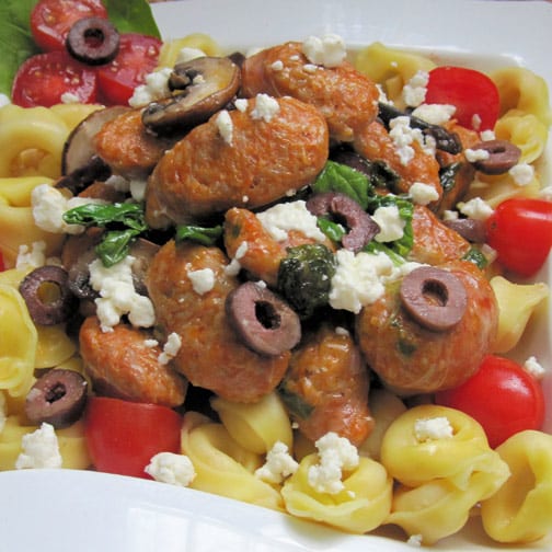 3. In a pot, boil tortellini. Drain. 4. In a large bowl, toss the tortellini with the spinach-sausage mixture. Add the grape tomatoes and toss. Sprinkle with feta cheese crumbles and garnish with additional grape tomatoes and black olives if desired.