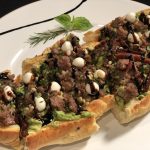 5. In a medium bowl, mash your avocado with a fork, spread over the garlic bread and season with salt, pepper and red pepper. Top with your crumbled sausage meat, pine nuts, mozzarella cheese, sun-dried tomatoes, parsley, rosemary and basil in the arrangement you desire. Drizzle with your balsamic glaze and dig in.