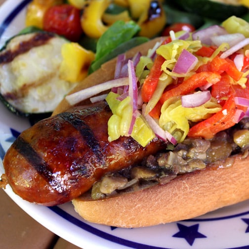 4. Transfer buns and sausages to plates; top with pickled onions, tapenade, and peppers. Serve.