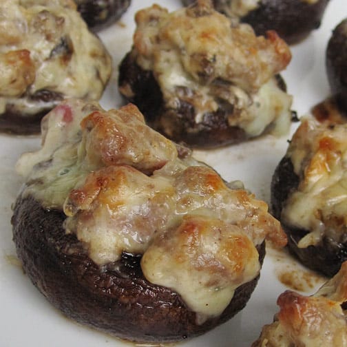 4. Arrange caps, stem-end up, on a baking sheet and mound about 2 teaspoons sausage filling in each. Bake until cheese is bubbly and mushrooms are tender but still hold their shape, about 10 minutes.