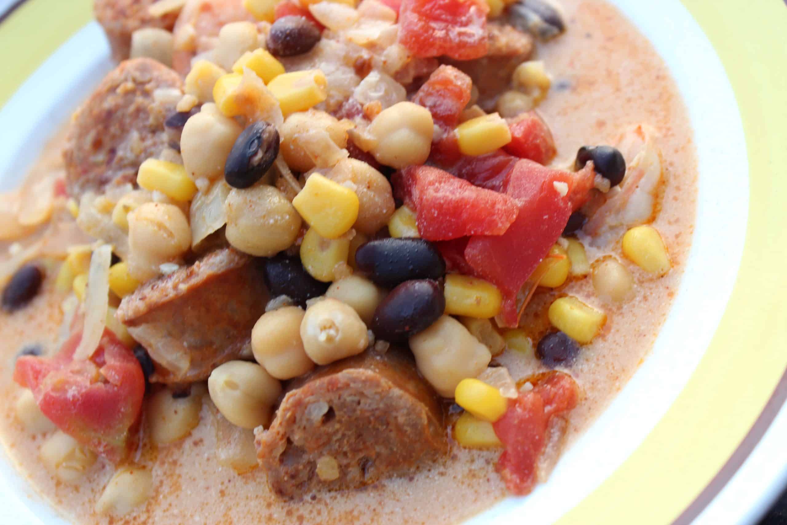 3. Stir in the beans, chick peas, corn and spices, and continue to simmer over low heat.
