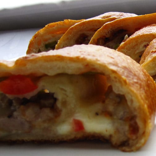 4. Roll out pizza crust onto counter, spread with cheese-meat mixture, making sure to go all the way to the edge. Roll dough back up into a log shape and bake until golden on the top, approximately 25 minutes.