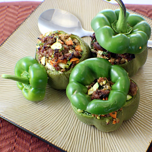 3. In a large bowl, lightly beat eggs. Add pre-cooked meat, and then add all remaining ingredients. Combine gently with your hands. Spoon mixture equally into the peppers.