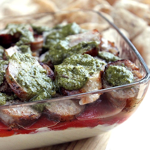 3. Distribute sliced chicken sausage evenly on top of peppers. Spread pesto on top of sausage.