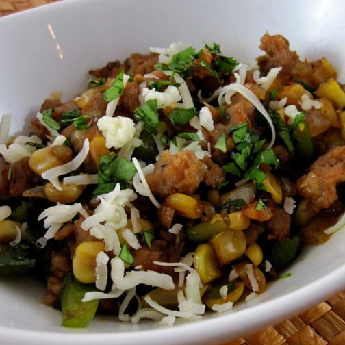 3. Add the caramalised sausage pieces to the sauted items. Add tomato sauce and check for salt. Garnish with grated cheese and cilantro leaves. Serve hot.